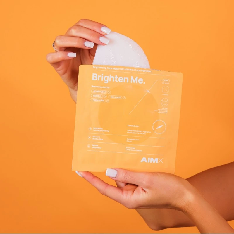 AIMX skaistinanti lakštinė veido kaukė su vitaminu C BRIGHTEN ME rekomenduojama skaistumo praradusiai odai.