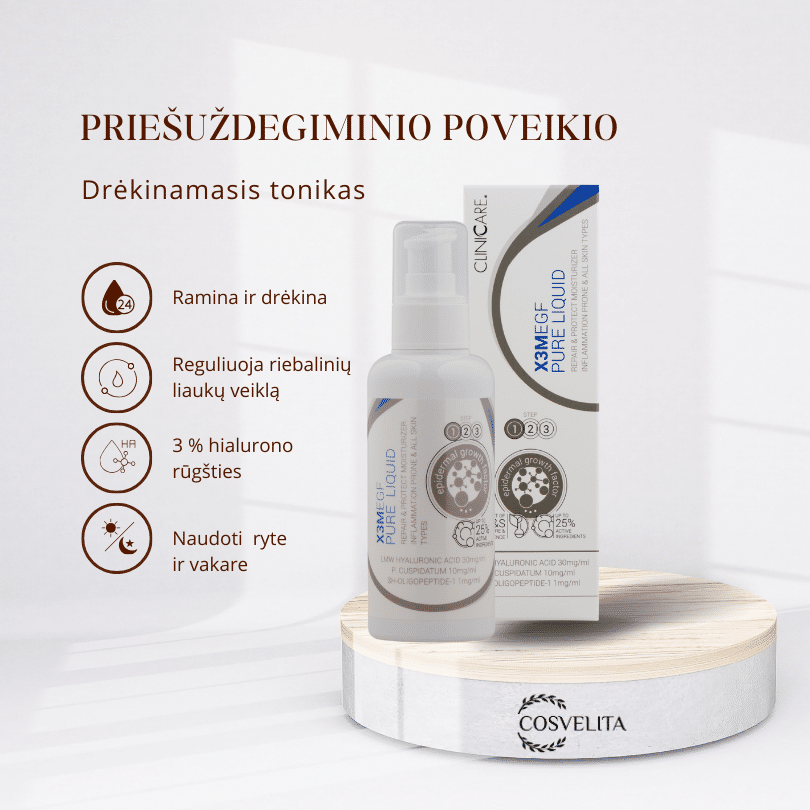 Cliniccare X3M EGF PURE priešuždegiminio poveikio losjonas tinka visiems odos tipams, ypač riebiai, jautriai ir į spuogus linkusiai veido odai.