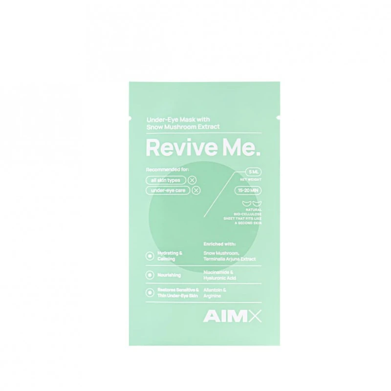 Drėkinanti ir gaivinanti paakių kaukė su hialuronu AIMX „Revive Me“ prisotinta „Sniego” grybo ekstraktu, niacinamidu, hialurono rūgštimi bei kitais augaliniais ekstraktais, priglunda tarsi antra oda, todėl visiškai nevaržo judesių.