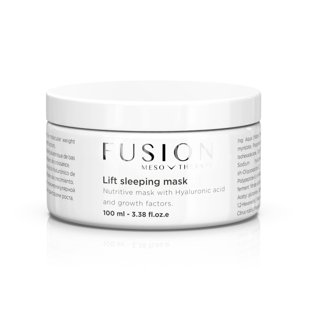 Fusion naktinės kaukės sudėtyje yra hialurono rūgšties, 5 augimo faktoriai, naudojami estetinėje medicinoje, kad būtų užtikrintas pilnavertiškas antisenėjimo poveikis, raukšlių mažinimas.