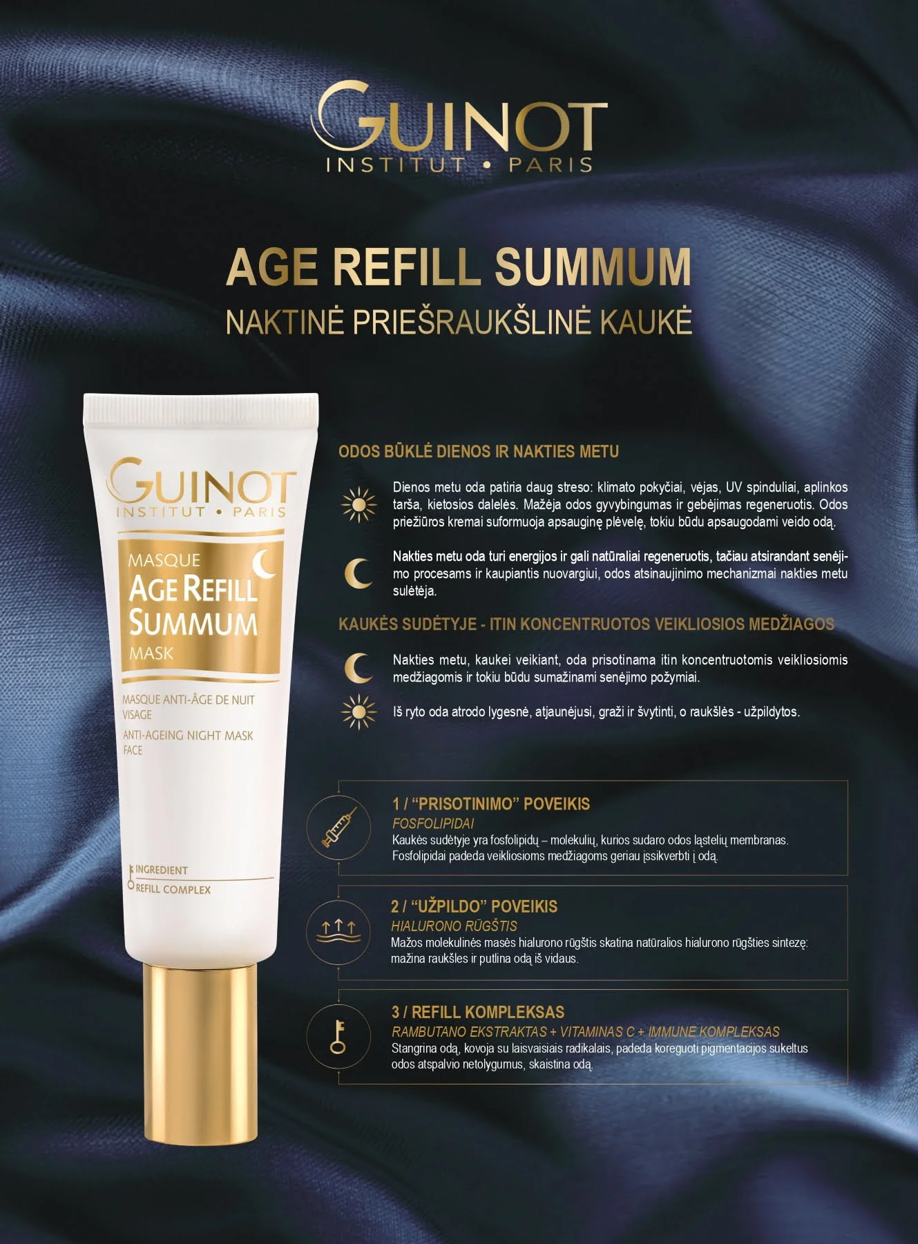 Guinot Age Refill Summum Mask priešraukšlinė naktinė veido kaukė, kuri nakties metu užpildo odą didelės koncentracijos veikliosiomis medžiagomis, mažina odos senėjimo požymius.
