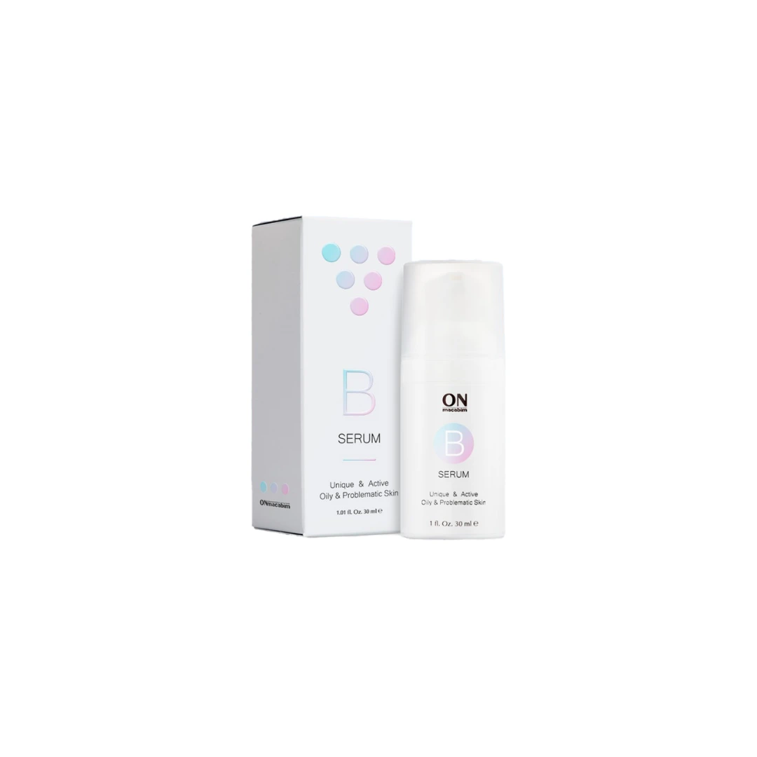 Aktyvus Onmacabim B serumas su niacinamidu ir bakučioliu padeda atkurti odos balansą ir skaistumą.