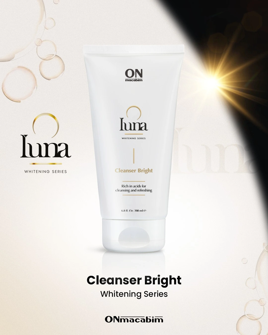 ONmacabim LUNA valomasis gelis su šviesinamuoju poveikiu skirtas visų tipų odos valymui.